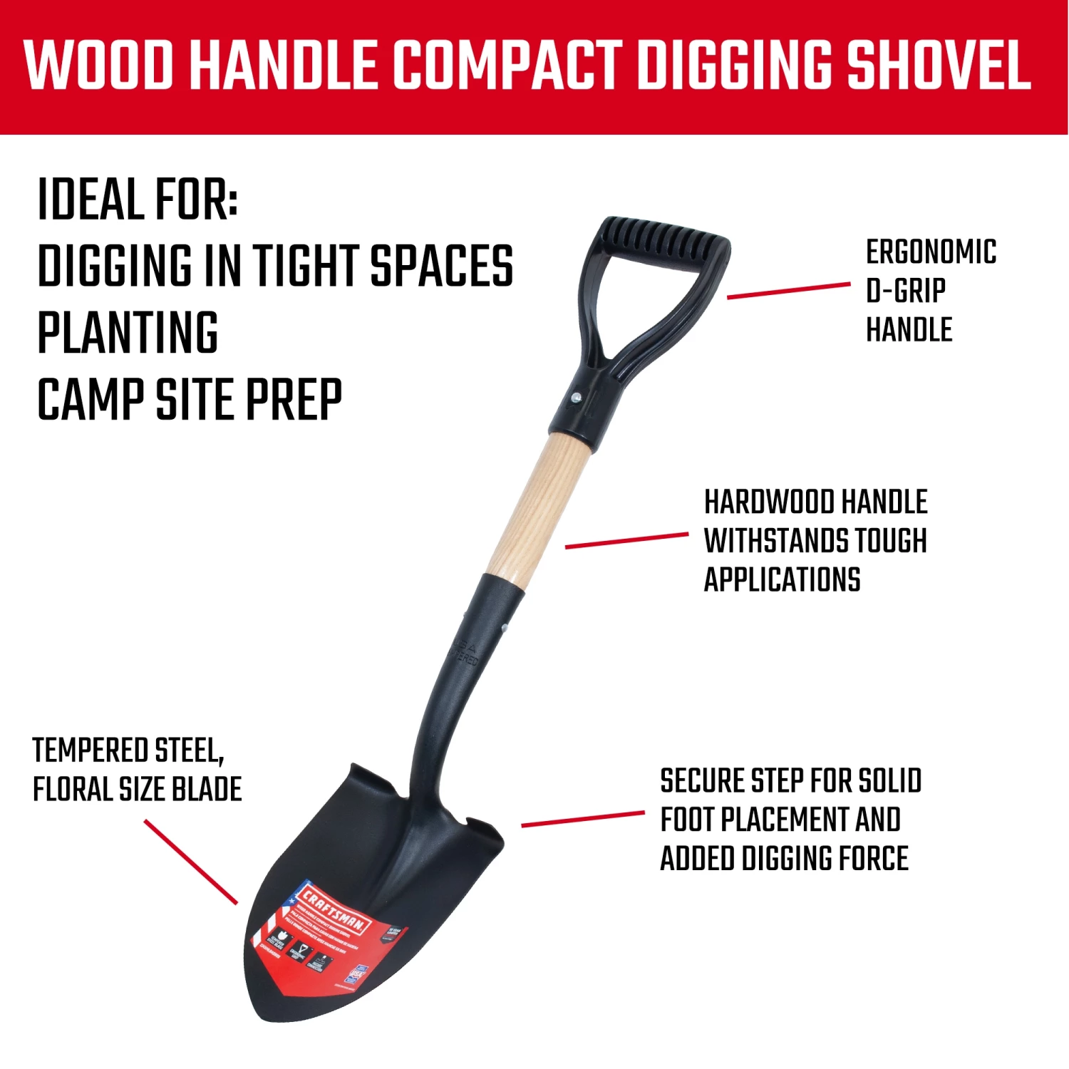 The CRAFTSMAN wood handle compact digging shovel is ideal for digging and gardening in tight spaces or when working on your knees. The poly d-grip handle and round point blade make this a solution for use in the garden, campsite or as an emergency shovel to store in the trunk of your car. The CRAFTSMAN® wood handle compact digging shovel is the ideal utility shovel for everyday tasks.