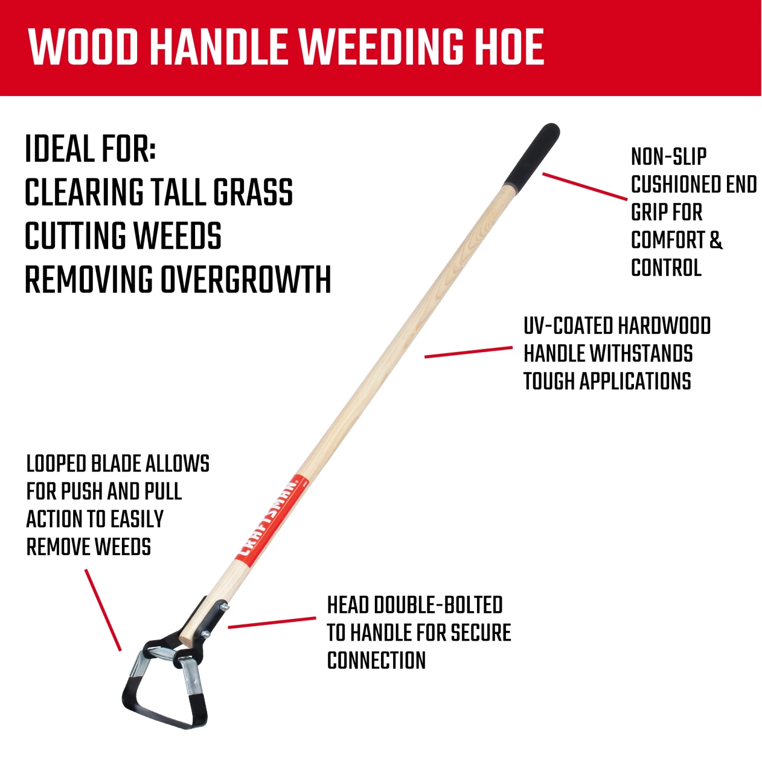 The CRAFTSMAN wood handle weeding hoe is the ideal solution to remove weeds from garden beds and other loose ground environments. The 54 In. hardwood handle and looped steel blade allows you to push and pull to remove weeds while standing. The bolted blade connection allows the CRAFTSMAN® wood handle garden hoe to be durable every season.