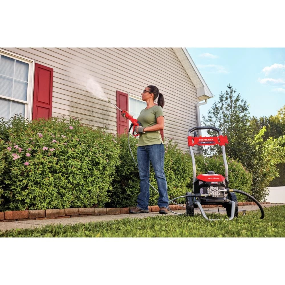CRAFTSMAN® 2,100 MAX PSI Electric Cold Water Pressure Washer is durable, mobile, and powerful enough for outdoor cleaning. With four nozzles, including a turbo nozzle, you have the accessories you need to wash your car or clean your sidewalk. The pressure washer wand contains a comfort grip that is designed for ease of use and features an innovative T-Rail Handle System, so your wand stays locked in during transport. Onboard storage for wand, hose, cord, and nozzles gives you a home for these accessories.