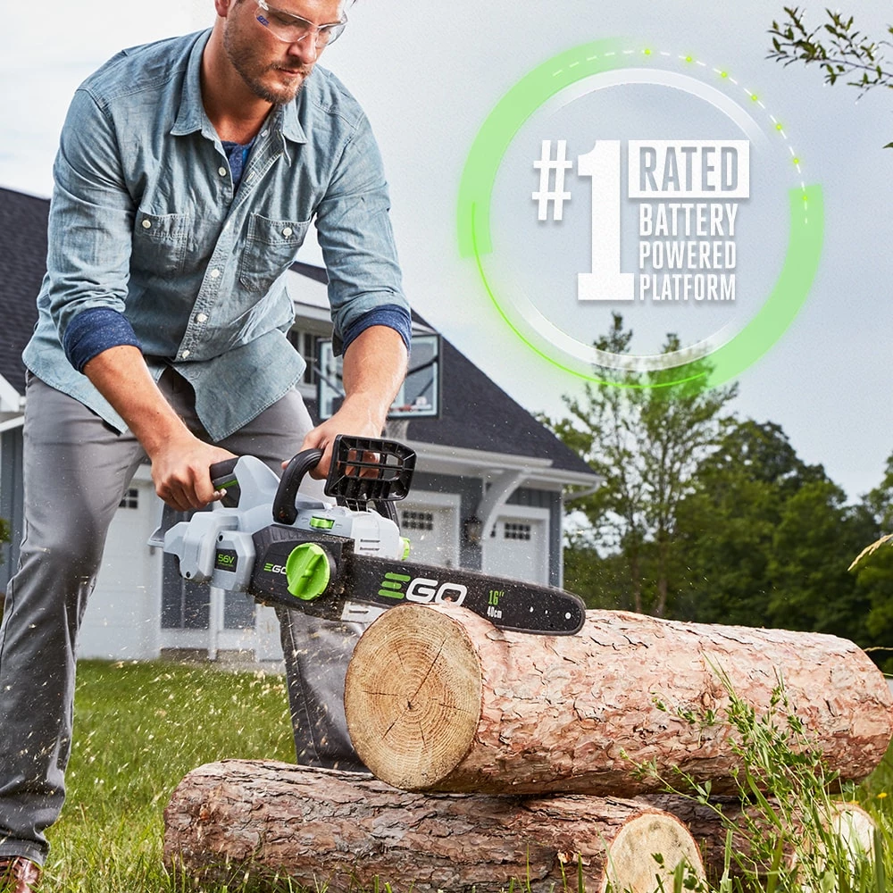 The EGO POWER+ Chain Saw truly delivers Power Beyond Belief. The 16-In bar and chain, combined with a hi-efficiency brushless motor provides effortlessly smooth cuts. The brushless motor extends both the life of the tool and the run time. The advanced 56V ARC Lithium™ battery uses industry-leading technology to deliver Power Beyond Belief and is compatible with all EGO POWER+ products. The EGO POWER+ Chain Saw delivers the performance of gas without the noise, fuss and fumes.